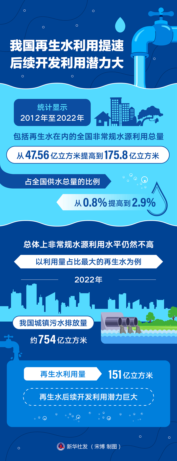 “總體上非常規(guī)水源利用水平仍然不高,以利用量占比最大的再生水為例,2022年我國城鎮(zhèn)污水排放量約754億立方米,再生水利用量為151億立方米,再生水后續(xù)開發(fā)利用潛力巨大?!敝苷苡钫f。