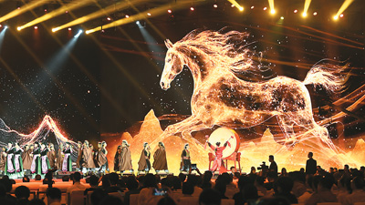 在新疆民歌《青春舞曲》的旋律中,身著維吾爾族服飾的表演者們手持果盤、載歌載舞,帶來了夏日新疆的陽光與青春。在《我的祖國》的悠揚旋律中,舞臺上五扇金色的書型大門緩緩開啟,東鄉(xiāng)族翻譯家艾布等5位駿馬獎翻譯獎得主來到舞臺中央。艾布把曾獲第十二屆駿馬獎的廣西瑤族作家紅日的長篇小說《駐村筆記》翻譯成維吾爾語,原著與譯著獲同一殊榮,在該獎評獎歷史上還是第一次。兩本書的創(chuàng)作和翻譯故事通過活動被更多人所知。本屆盛典與電視晚會和網(wǎng)絡(luò)平臺直播充分融合,展現(xiàn)民族文學(xué)發(fā)展成就,助力文學(xué)“破圈”傳播。