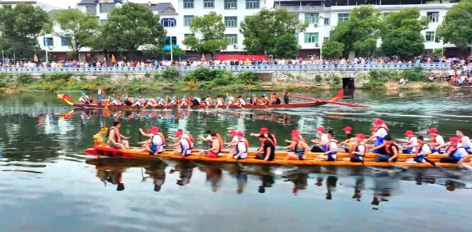 在玉琊溪文成、橫街和饒北河臨湖河段,參賽選手?jǐn)夭だ耍归_激烈競賽,觀眾的加油喝彩聲,歡慶的鼓聲響徹玉琊溪、饒北河兩岸,場面熱鬧非凡。