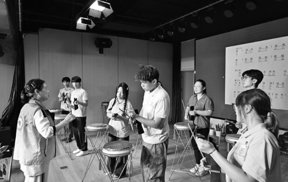 講解結束后,小分隊成員在李小英的指導下進行實操練習。握鼓槌的姿勢、擊鼓的力度、節(jié)奏的變換,針對每個細節(jié),李小英都耐心示范、逐一糾正,手把手傳授技藝。師生們在反復練習中感受著鄱陽大鼓的韻律之美,現(xiàn)場氣氛熱烈而專注。