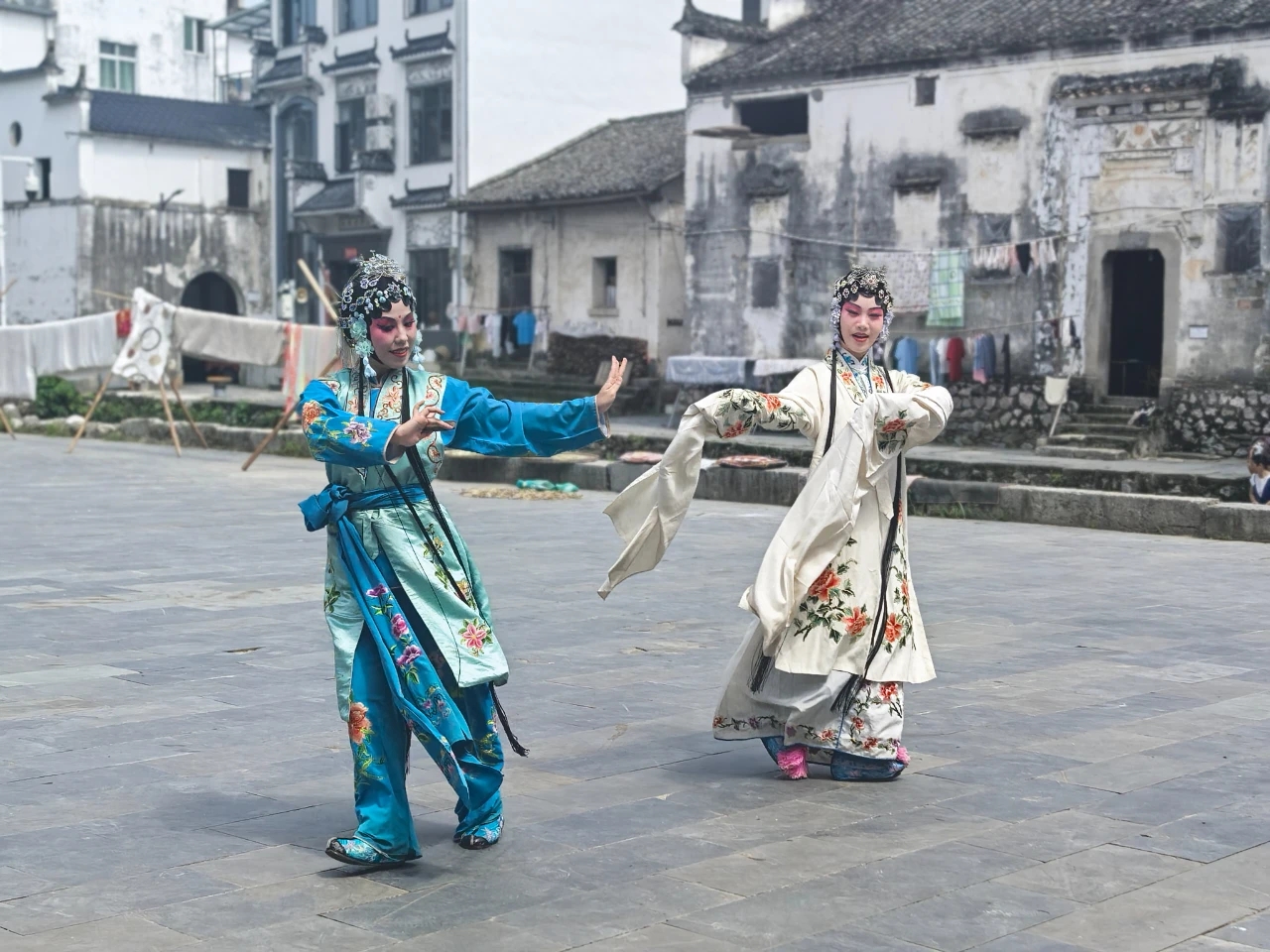 近日,婺源縣開展送文化下鄉(xiāng)文明實踐活動。徽劇傳習所的演員們冒著高溫酷暑,為村民表演徽劇、儺舞等節(jié)目,豐富當?shù)厝罕娢幕睢?單長華 攝