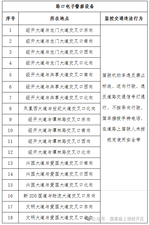 為保障群眾出行安全和道路交通暢通,預(yù)防和減少道路交通事故發(fā)生,全力營造良好的道路交通環(huán)境,依據(jù)《中華人民共和國道路交通安全法》《中華人民共和國道路交通安全法實施條例》《江西省實施〈中華人民共和國道路交通安全法〉辦法》等相關(guān)法律法規(guī),將于2025年10月23日零時起,在上饒經(jīng)濟(jì)技術(shù)開發(fā)區(qū)范圍啟用一批交通技術(shù)監(jiān)控設(shè)備?,F(xiàn)將具體信息公告如下: