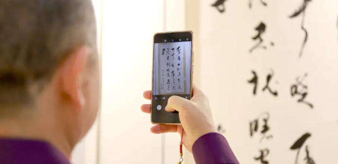 展覽現(xiàn)場,老年大學(xué)草書班老師潘榮炎化身"導(dǎo)覽員",為觀眾解讀筆法奧秘。一群觀眾圍成半圓,或頷首沉吟,或舉機記錄,隨導(dǎo)覽節(jié)奏漸入書道之境。講解《登黃鶴樓》時,老師以"千里江陵"的連綿筆勢為例,揭示草書氣脈貫通之理;行至《盛世中華》前,不禁引發(fā)觀眾對時代的共鳴;《中堂》的雄渾結(jié)體、《龍舞》的疾澀韻律、《雄風(fēng)》的鐵畫銀鉤,皆化作深入淺出的筆墨哲思。前來參展的書法愛好者童先生說道:“聽完潘老師的講解,既讓我感受到中鋒硬筆的功底,更又讓我領(lǐng)悟到草書創(chuàng)新的風(fēng)格,從中受益匪淺,靈感迸發(fā)?!?/p>