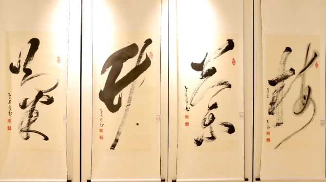 跟隨黎老師的腳步,我們來到了展廳,滿墻的草書作品或如驚濤拍岸,或似行云流水,現(xiàn)場的觀者或駐足于狂草長卷前屏息凝神,細(xì)品筆鋒轉(zhuǎn)折處的跌宕起伏;或圍立在自創(chuàng)詩文作品旁低聲吟誦,感受“銀發(fā)書家”筆下的家國情懷。四君子主題展區(qū)尤為雅致,《梅》作焦墨老干如篆籀,《蘭》以淡墨寫出空谷幽香,《竹》葉似劍戟破空,《菊》瓣含金鉤鐵畫,引得觀眾競相拍照。