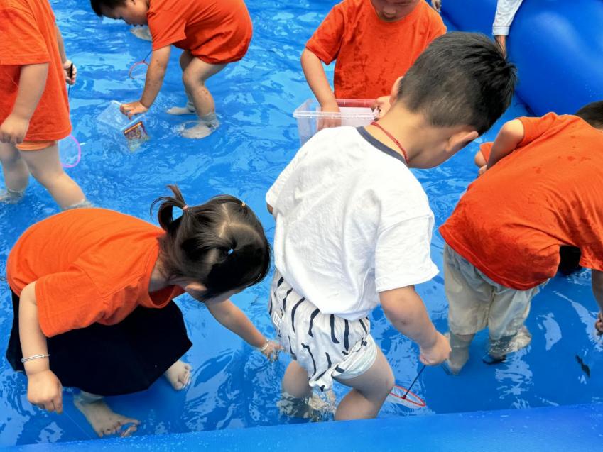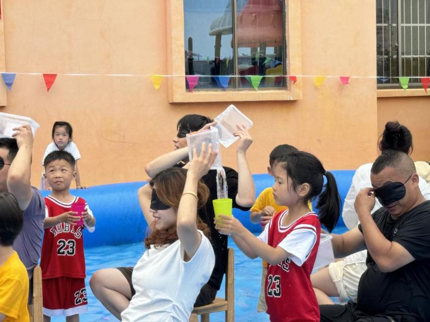 活動精心設(shè)置多項(xiàng)趣味游戲,包括“水上疊疊杯接力賽”“運(yùn)球大作戰(zhàn)”“水上投籃”“抓泥鰍”“蒙眼倒水”等。幼兒與家長共同參與其中,現(xiàn)場氛圍熱烈。