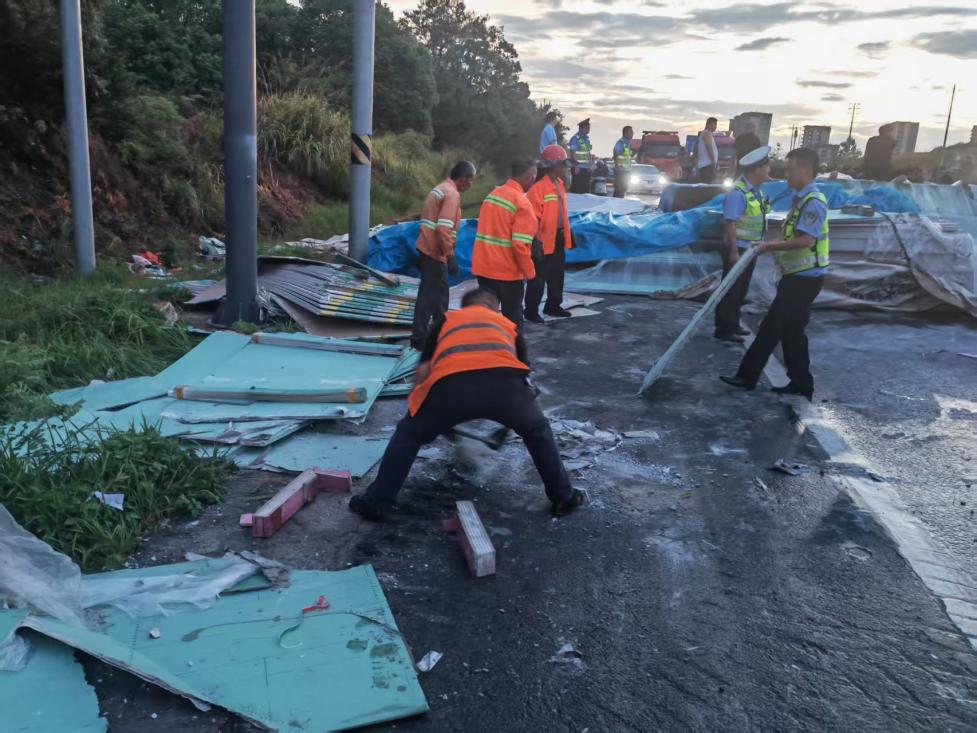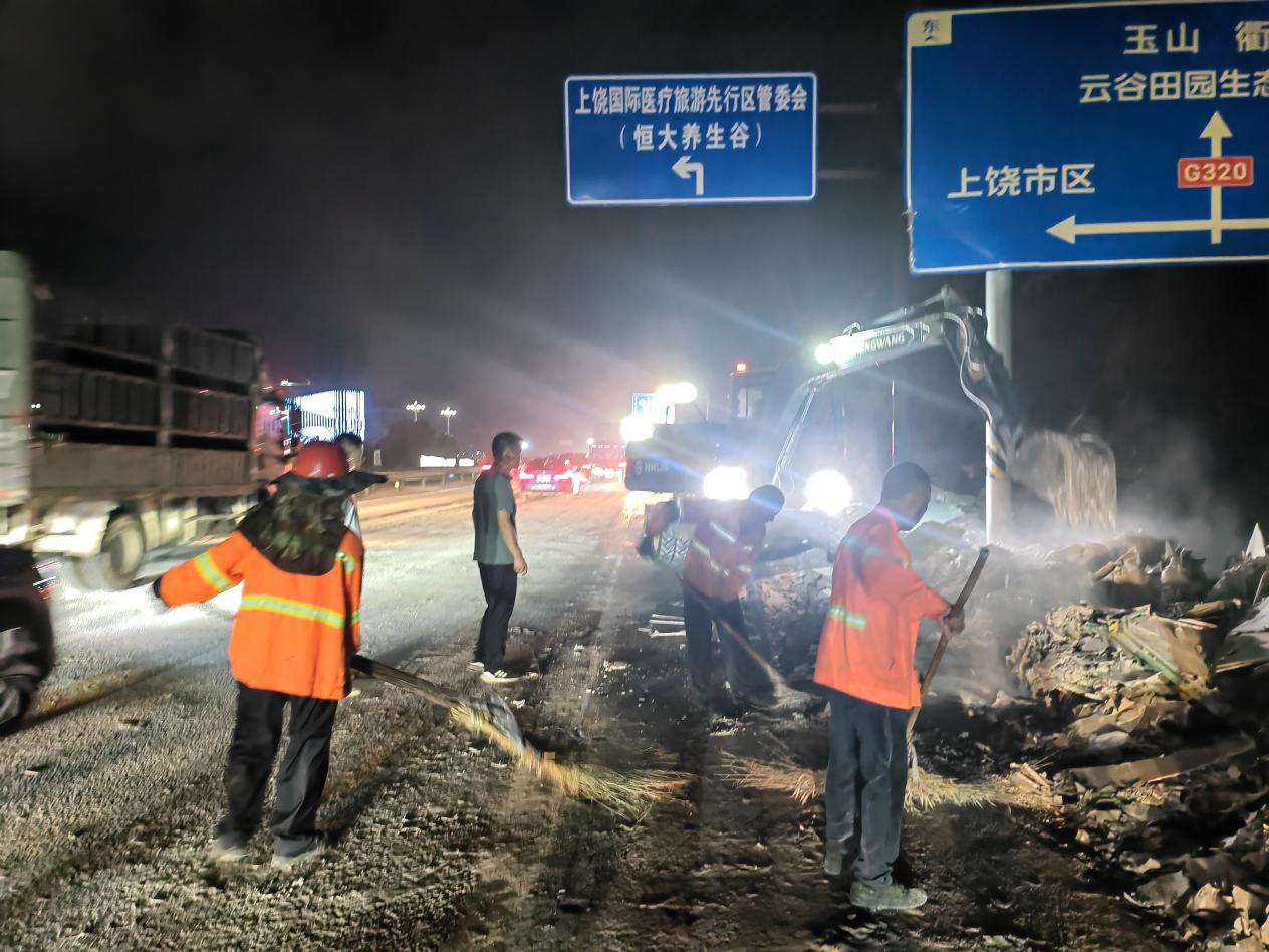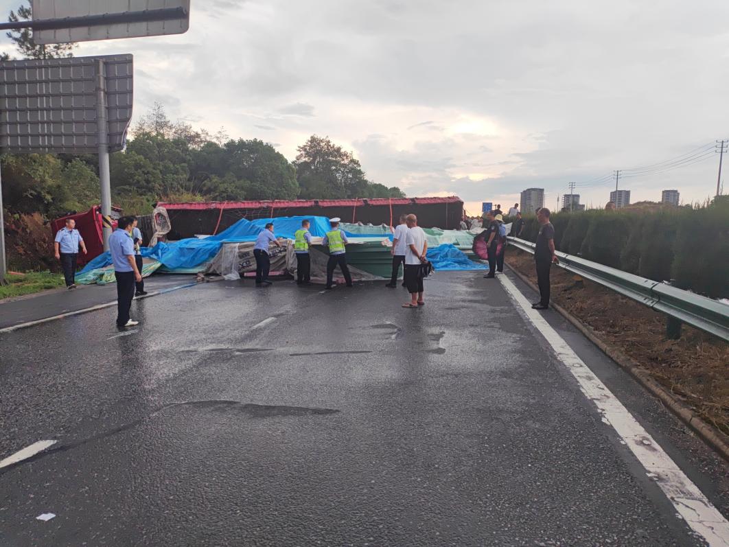 9月8日下午4點(diǎn)30分許,上饒市信州區(qū)突發(fā)短時(shí)強(qiáng)降雨,G320國(guó)道廣信區(qū)往信州區(qū)距機(jī)場(chǎng)大道路口200米處一輛滿載貨物的重型貨車失控側(cè)翻,車廂內(nèi)部分貨物散落至路面,瞬間造成交通中斷,散落的貨物還形成了影響后續(xù)車輛通行的“移動(dòng)障礙”,存在二次事故隱患。
