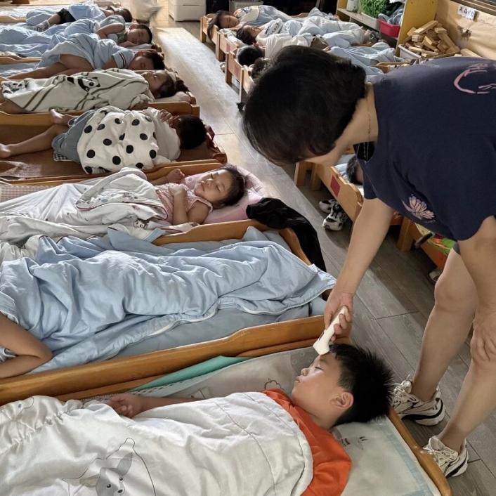考慮到午睡環(huán)節(jié)是幼兒園安全管理的高風(fēng)險點,培訓(xùn)還聚焦午睡看護細則。保健醫(yī)生強調(diào),午睡是幼兒能量補給的關(guān)鍵時段,需以極大的耐心、細心與責任心筑牢安全防線。并明確“一問二查三測”的午睡前安檢流程,即詢問幼兒身體狀況、檢查口腔及隨身物品、測量體溫;細化“四巡五看六聽”的午睡中動態(tài)監(jiān)護要求,包括定時輕步巡視、觀察面色呼吸睡姿、傾聽呼吸及異常聲響,全方位規(guī)范午睡管理。