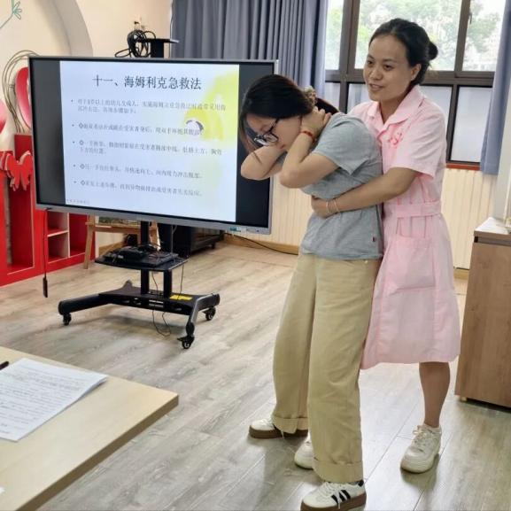 海姆立克急救法實操是本次培訓(xùn)的重點環(huán)節(jié)。保健醫(yī)生與教職工采取“兩人一組、角色扮演”的實戰(zhàn)模式,分步演示標準操作:針對幼兒,講解如何準確定位并實施拍背法與胸部沖擊法;針對成人互救,示范背后腹部沖擊動作;針對自救,指導(dǎo)利用椅背等物體進行應(yīng)急處置。從園長到教師再到后勤人員,全員參與實操演練,在專業(yè)指導(dǎo)下互相切磋、糾正手法,確保每一個動作都標準規(guī)范,保障黃金救援時間內(nèi)的處置效果,現(xiàn)場學(xué)習(xí)氛圍嚴謹熱烈。