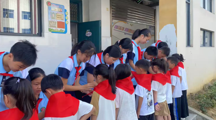 激昂的中國(guó)少年先鋒隊(duì)隊(duì)歌旋律響起,全體人員齊聲高唱。歌聲嘹亮,充滿朝氣,展現(xiàn)了少先隊(duì)員們積極向上的精神風(fēng)貌。學(xué)生們身著整潔校服,隊(duì)列整齊,神情專注。儀式核心環(huán)節(jié)中,老隊(duì)員鄭重為新隊(duì)員佩戴紅領(lǐng)巾——這一革命先烈鮮血染紅的象征。新隊(duì)員挺胸昂首,眼神洋溢著自豪與激動(dòng),紛紛敬禮致謝,傳遞著薪火相傳的使命。