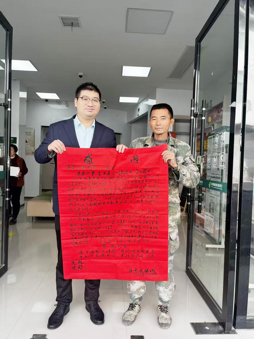 回到家后,汪志成心里的暖意遲遲未散。他翻出紅紙,一筆一劃寫下感謝信:“區(qū)區(qū)小事,足見其心,行表在人,令人感動……昨日郵政遇難題,張行伸手解我急。手把手教多耐心,老朽感恩永記之?!辟|(zhì)樸的字句里,滿是對郵政工作人員的認(rèn)可。