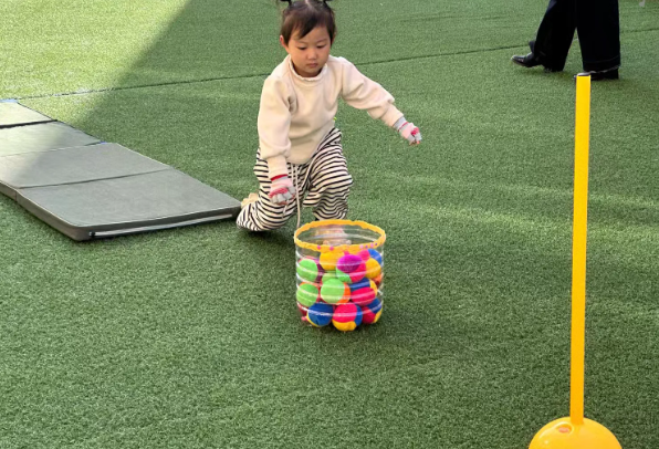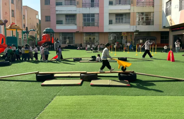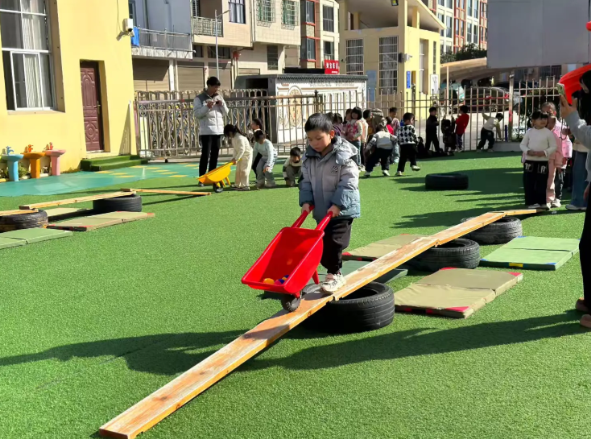 運(yùn)動(dòng)會(huì)根據(jù)不同年齡段幼兒特點(diǎn)設(shè)計(jì)了六項(xiàng)特色賽事。小班萌娃化身“小刺猬”,頂著粘滿“果子”的背板在障礙物間穿梭,《小刺猬運(yùn)果子》游戲讓孩子們?cè)阢@爬中提升肢體控制能力;《小熊過(guò)冬》則通過(guò)模仿小熊跳躍的動(dòng)作,幫助幼兒掌握平衡技巧。中班的《雪地小騎兵》項(xiàng)目中,孩子們騎著平衡車飛馳而過(guò),在起伏賽道上展現(xiàn)出色的平衡感;《龍虎爭(zhēng)奪戰(zhàn)》采用兩兩對(duì)抗模式,培養(yǎng)幼兒的競(jìng)爭(zhēng)意識(shí)與規(guī)則觀念。大班哥哥姐姐挑戰(zhàn)《冬日運(yùn)輸隊(duì)》,推著小車過(guò)獨(dú)木橋、繞障礙跑,綜合鍛煉奔跑與平衡能力;壓軸的《輪胎大力士》接力賽更是將氣氛推向高潮,孩子們合作拖運(yùn)輪胎穿越障礙,在吶喊助威聲中體會(huì)團(tuán)隊(duì)協(xié)作的意義。