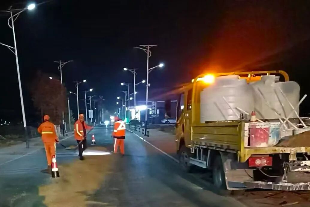 搶險(xiǎn)人員抵達(dá)現(xiàn)場(chǎng)后,立即開(kāi)展應(yīng)急處置:在事發(fā)路段兩端規(guī)范設(shè)置警示標(biāo)志,引導(dǎo)過(guò)往車輛減速避讓;同步采用鋪灑沙子吸附油污的專業(yè)處置方式,待油污凝結(jié)后,使用掃帚、鐵鏟等工具對(duì)油污顆粒進(jìn)行集中清理。深夜,寒風(fēng)凜冽,身著橘紅色工裝的搶險(xiǎn)人員頂風(fēng)冒寒持續(xù)作業(yè)。經(jīng)過(guò)一小時(shí)緊張?zhí)幹?,路面油污被徹底清理干凈,該路段隨即恢復(fù)正常通行,及時(shí)消除了道路安全隱患。
