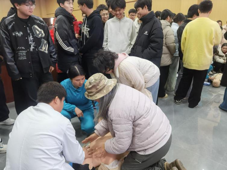 理論授課結(jié)束后,實(shí)操演練環(huán)節(jié)有序展開。中醫(yī)院院區(qū)的醫(yī)護(hù)團(tuán)隊(duì)化身“實(shí)操教練”,逐一示范胸外按壓的手勢、力度與節(jié)奏,開放氣道的正確手法,以及人工呼吸的操作要領(lǐng),每個(gè)動(dòng)作都規(guī)范標(biāo)準(zhǔn)、講解細(xì)致,確保師生們直觀清晰地掌握操作細(xì)節(jié)。在醫(yī)護(hù)人員的手把手指導(dǎo)下,同學(xué)們踴躍上前實(shí)操體驗(yàn),認(rèn)真模仿心肺復(fù)蘇按壓動(dòng)作,反復(fù)感受發(fā)力部位與節(jié)奏把控;對于按壓位置偏移、力度不足、頻率過快等不規(guī)范問題,醫(yī)護(hù)人員及時(shí)糾正,耐心解答大家的疑問?,F(xiàn)場氛圍熱烈而有序,200余名師生通過“一看、二學(xué)、三練”的沉浸式學(xué)習(xí),成功實(shí)現(xiàn)從理論認(rèn)知到實(shí)操能力的轉(zhuǎn)化,切實(shí)掌握了基礎(chǔ)急救技能。