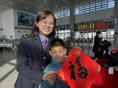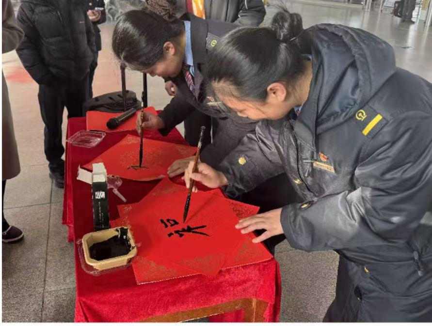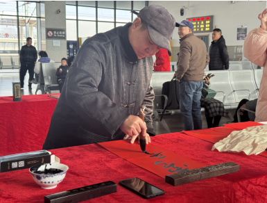 在另一處活動區(qū),書法愛好者現(xiàn)場揮毫?xí)鴮懘郝?lián)和“福”字,“平安順?biāo)臁薄皥F(tuán)圓美滿”等祝福語躍然紙上。志愿者將晾干的春聯(lián)、福字送到旅客手中,傳遞新春祝福。