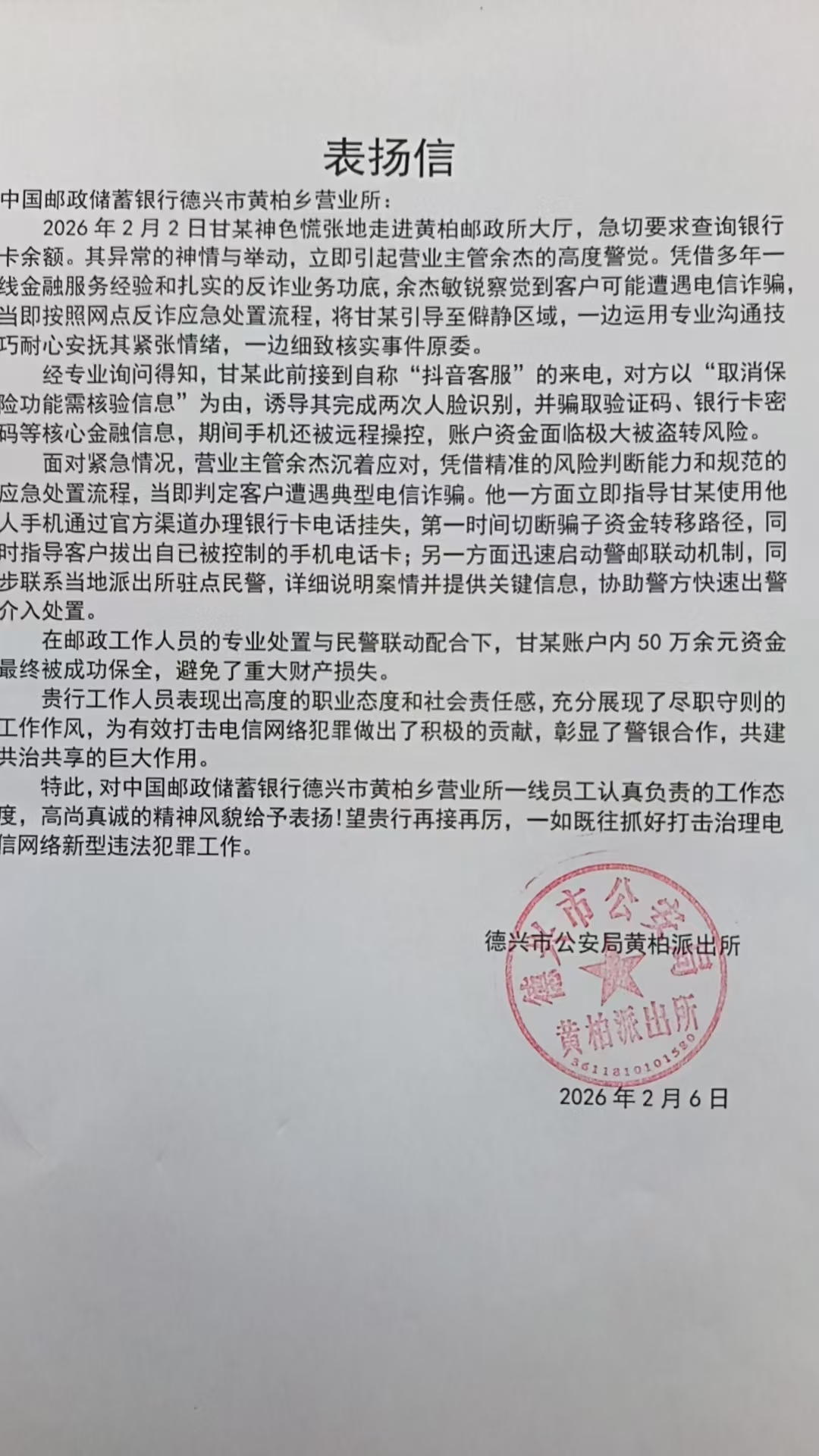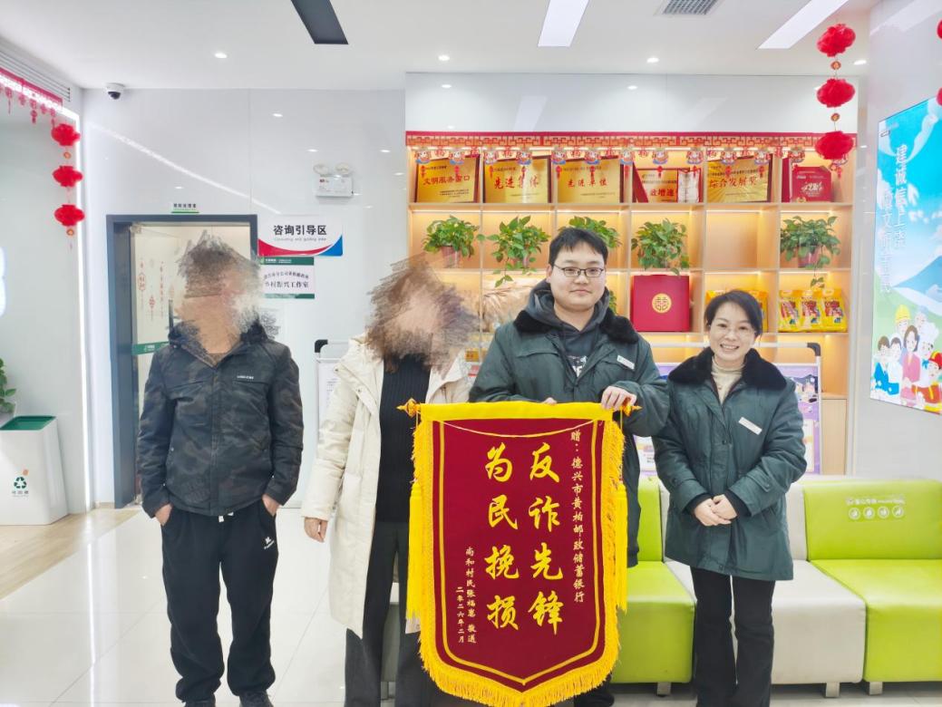 2月5日下午,德興市黃柏鄉(xiāng)郵政所內(nèi),客戶張某將一面印有“反詐先鋒 為民挽損”的錦旗鄭重送到工作人員手中,字里行間滿是對(duì)郵政人專業(yè)處置、守護(hù)群眾財(cái)產(chǎn)安全的由衷感謝。這面錦旗的背后,是德興市郵政分公司工作人員憑借專業(yè)素養(yǎng)與責(zé)任擔(dān)當(dāng),成功攔截一起50萬(wàn)余元電信詐騙案件的暖心實(shí)踐。