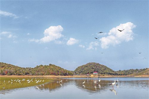 近日,樂平市鎮(zhèn)橋鎮(zhèn)與禮林鎮(zhèn)交界的栽禾峰水庫(kù)迎來(lái)“貴客”,成百上千只“鳥中國(guó)寶”東方白鸛或悠然涉水覓食,或凌空翩躚,白琵鷺、反嘴鷸等也在此結(jié)伴棲息。(記者 徐錚攝)