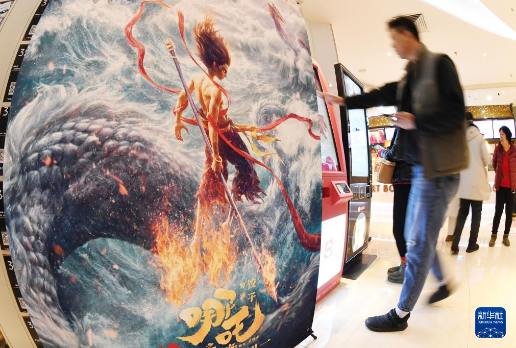 這是在北京市朝陽(yáng)區(qū)一家影院內(nèi)擺放的《哪吒之魔童鬧海》海報(bào)(2月13日攝)。