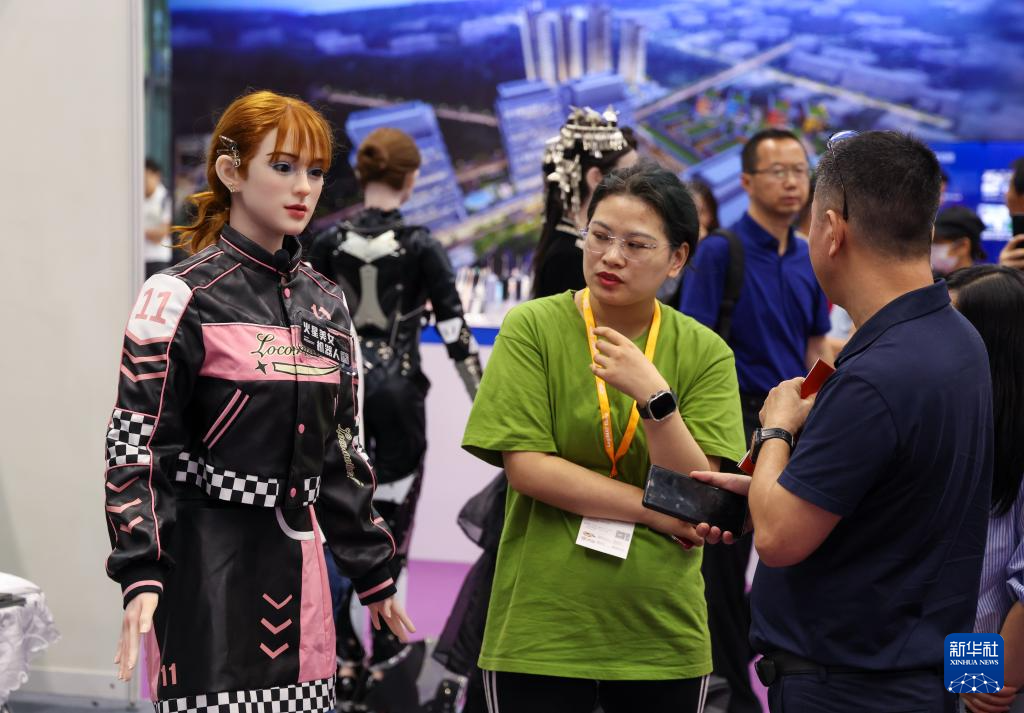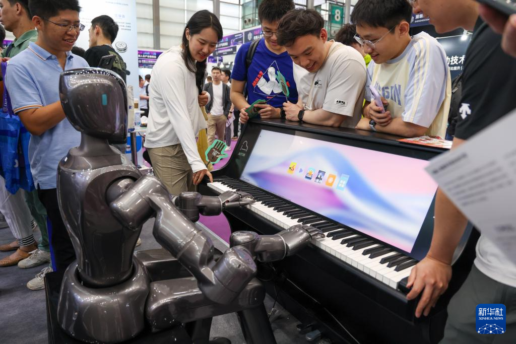 4月24日,參觀者觀看人形機(jī)器人彈鋼琴。