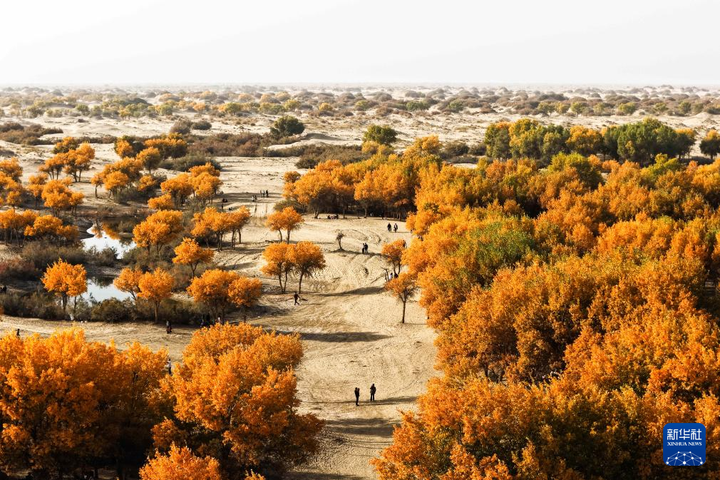 游客在新疆和田地區(qū)洛浦縣洛濱胡楊林景區(qū)游覽(無人機(jī)照片,10月19日攝)。