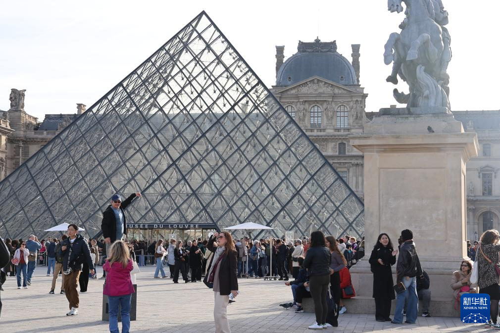 10月22日,在法國(guó)巴黎,大量游客聚集在盧浮宮博物館的玻璃金字塔入口前。