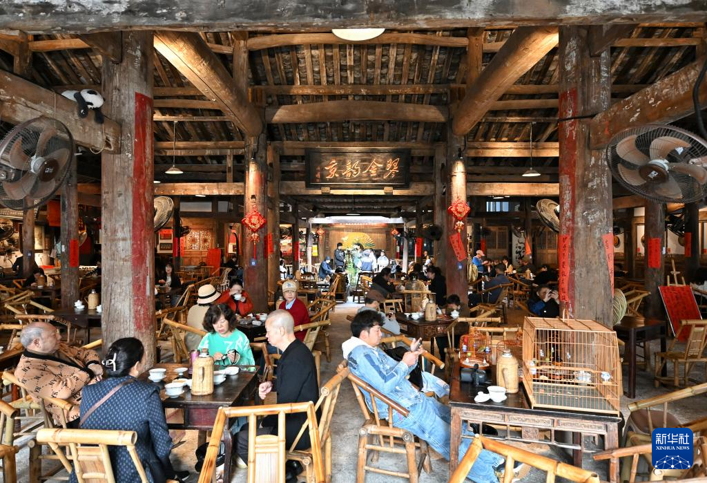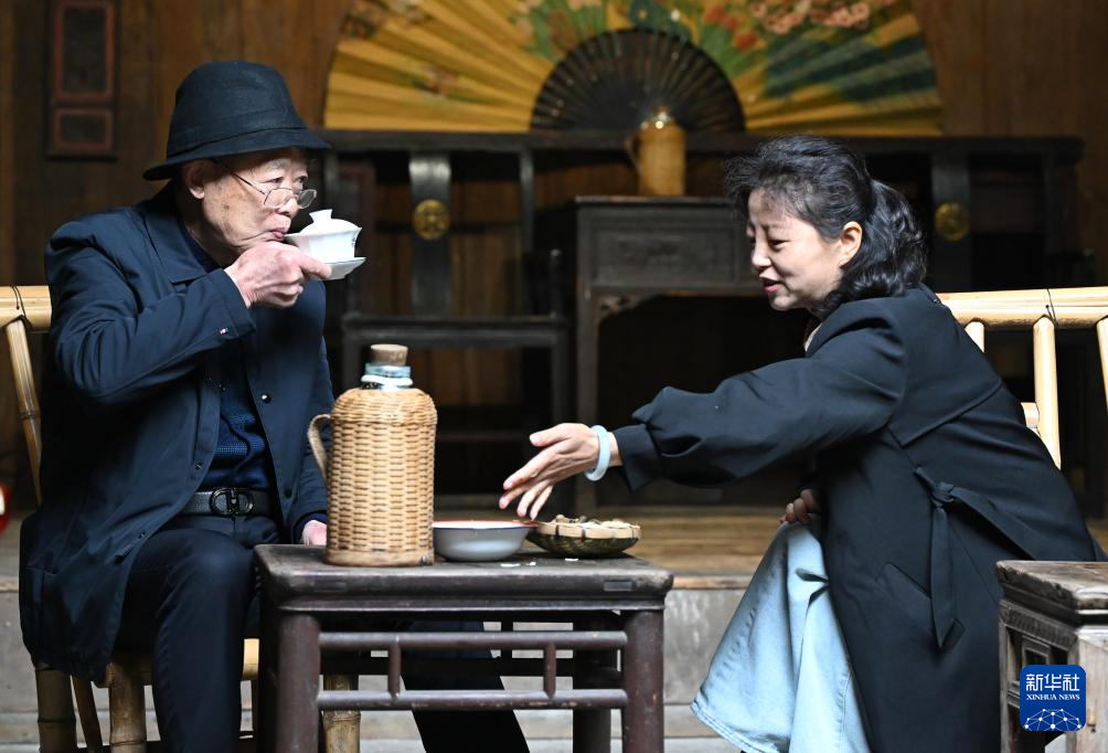 10月25日,茶客一邊喝茶一邊觀看節(jié)目。