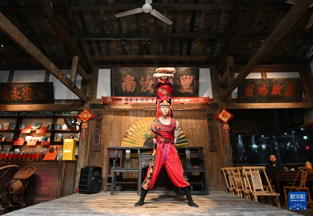 10月25日,作為第十四屆中國(guó)藝術(shù)節(jié)惠民活動(dòng),沈陽(yáng)雜技演藝集團(tuán)的雜技演員在成都金琴老茶館上演雜技節(jié)目《男子對(duì)手》。