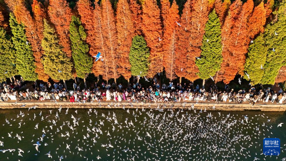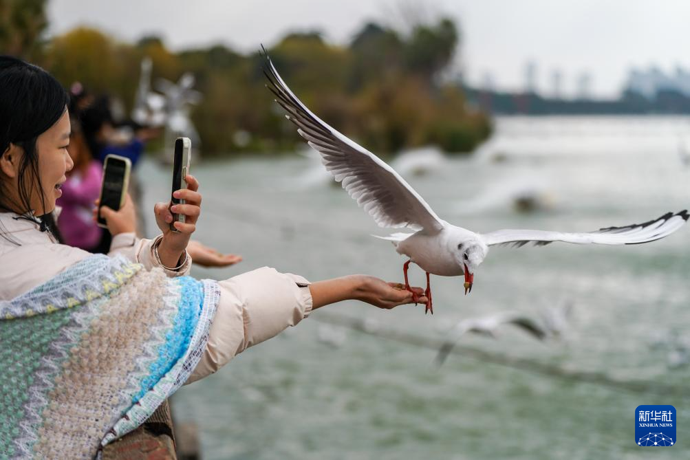 12月10日,游客在滇池畔的海洪濕地公園喂紅嘴鷗(無人機(jī)照片)。