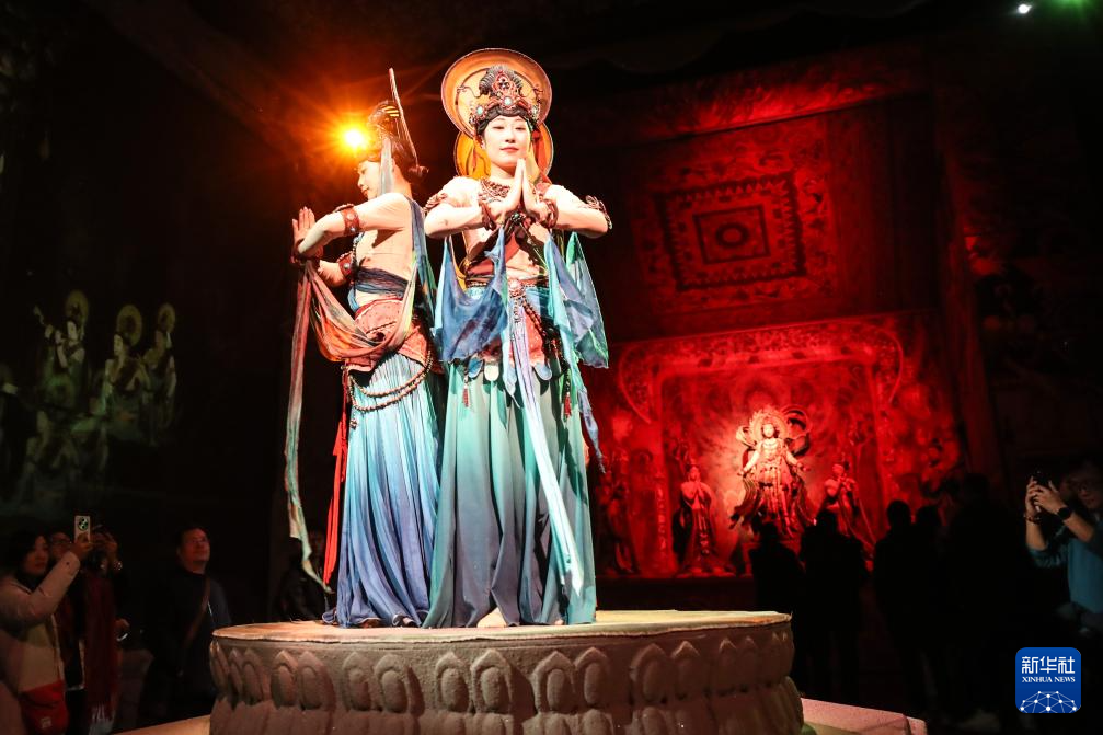 12月15日晚,大型洞窟式沉浸體驗(yàn)劇《樂動(dòng)敦煌》在甘肅省敦煌市持續(xù)上演,為游客展現(xiàn)了敦煌樂舞的獨(dú)特魅力。該劇全年常態(tài)化演出,彌補(bǔ)了當(dāng)?shù)囟緹o(wú)駐場(chǎng)演藝項(xiàng)目的缺憾,為“冬游敦煌”增添了新活力。