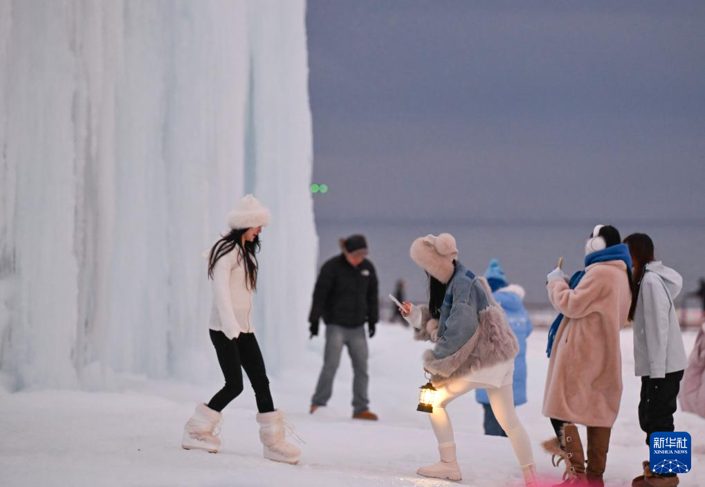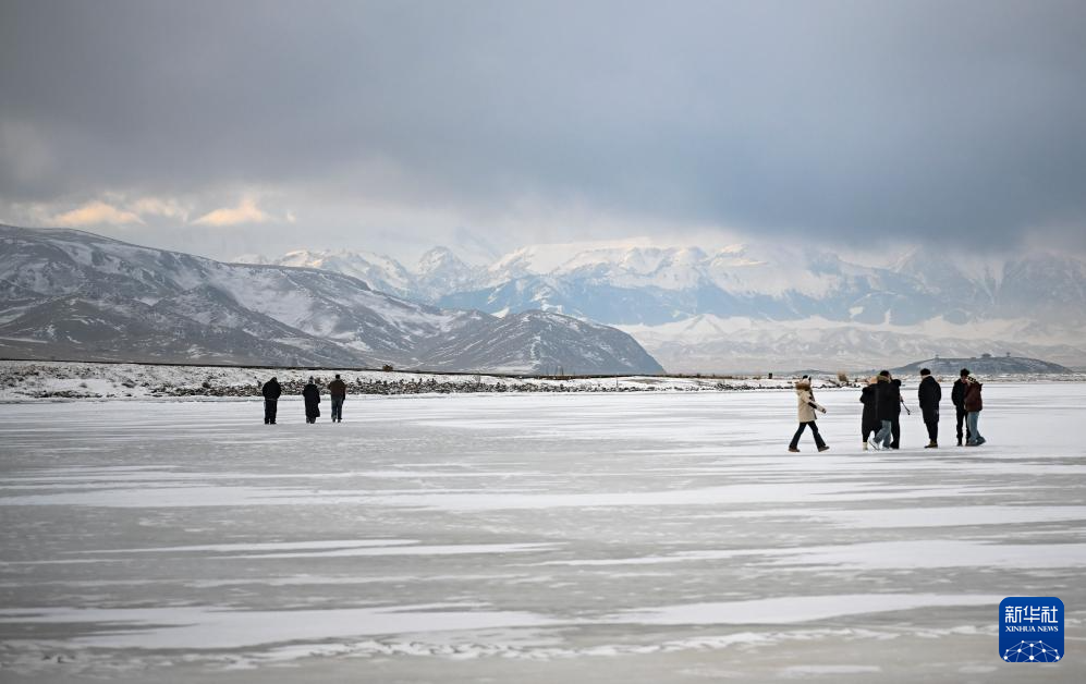游客在賽里木湖的冰面上游玩(12月16日攝)。