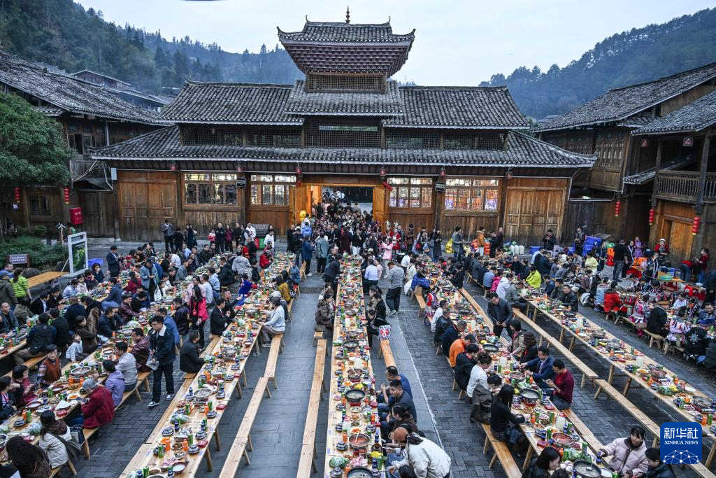在貴州省黎平縣肇興侗寨,侗族同胞與來(lái)賓在侗年活動(dòng)中共享長(zhǎng)桌宴(12月20日攝,無(wú)人機(jī)照片)。