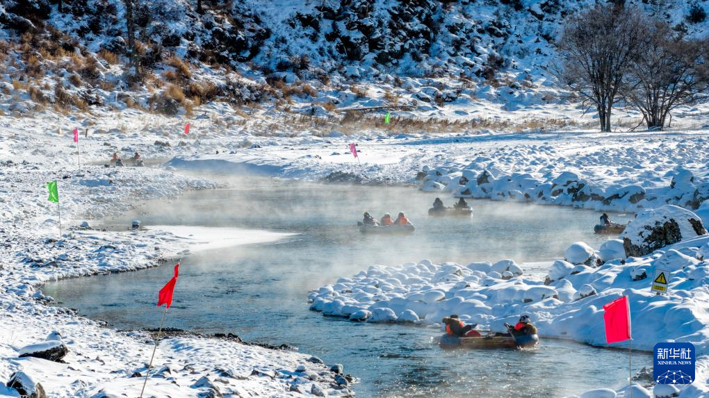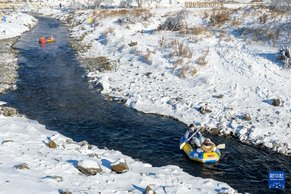 2026年1月1日,在內(nèi)蒙古興安盟阿爾山市,游客在哈拉哈河中體驗(yàn)不凍河漂流(無人機(jī)照片)。