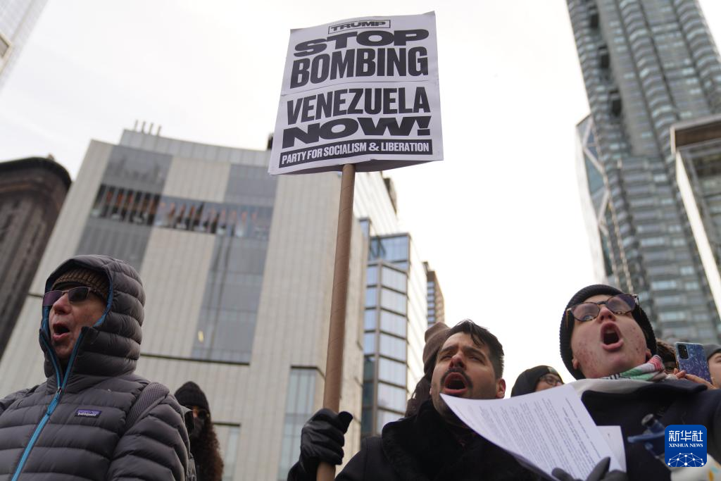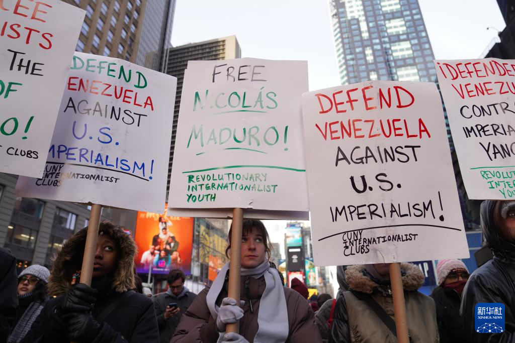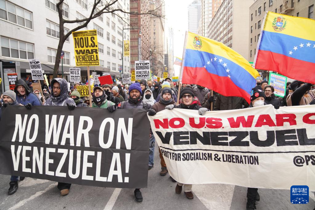 當(dāng)日,近千名民眾在美國(guó)紐約舉行集會(huì)游行,抗議美國(guó)對(duì)委內(nèi)瑞拉實(shí)施軍事打擊。
