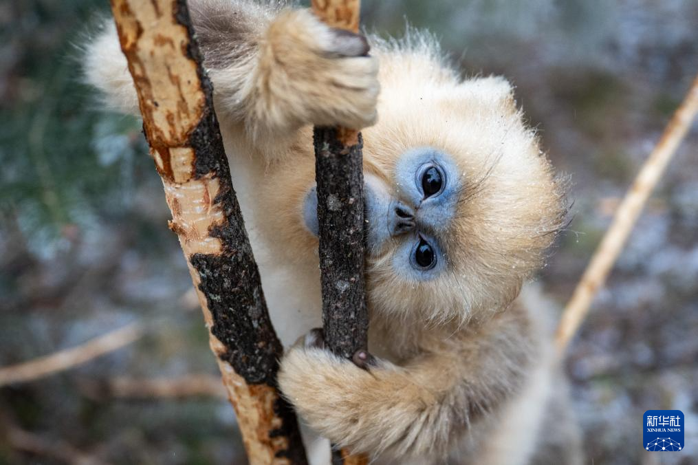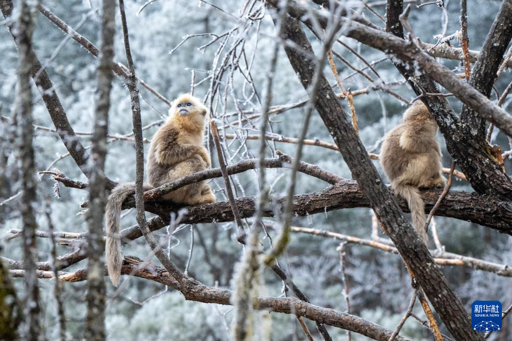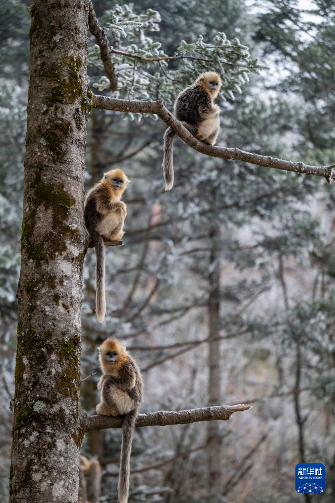 1月19日,金絲猴在神農架國家公園大龍?zhí)督鸾z猴野外研究基地山林中活動。