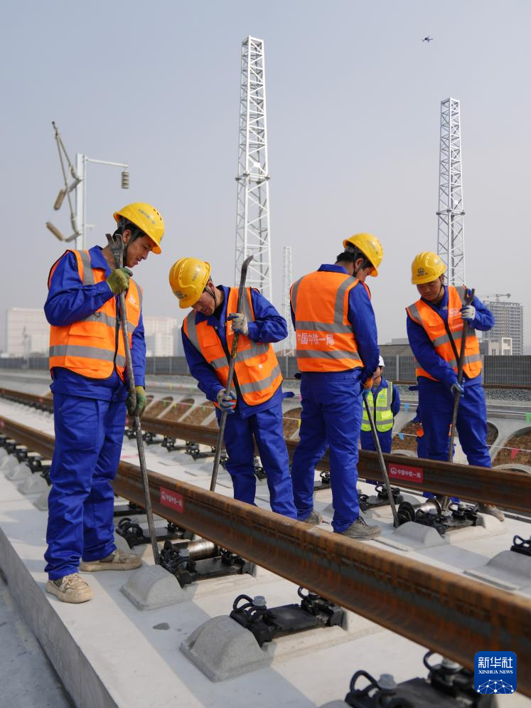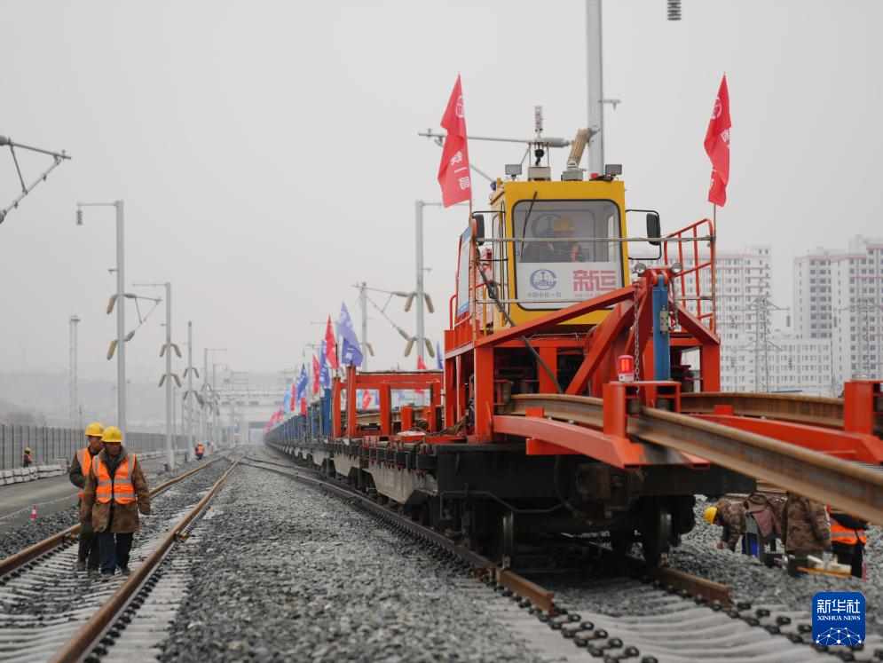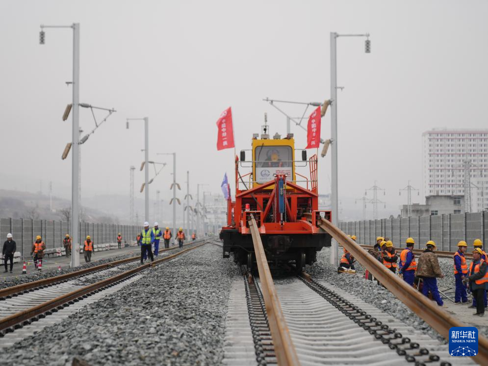 2月6日,中鐵一局施工人員在西康高鐵安康西站段鋪軌現(xiàn)場(chǎng)作業(yè)。